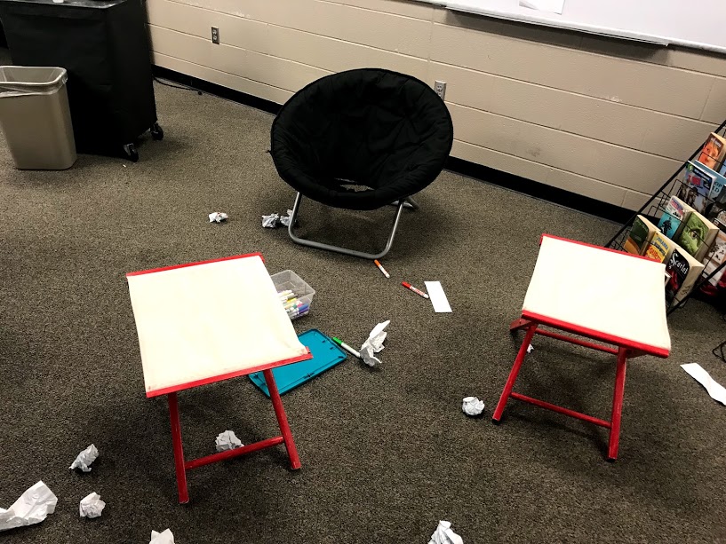 The students started in the hall waiting to enter Base Camp. I handed them their climbing permits and told them about the camps they could choose from: 3 pods of desks, a floor table, some comfy chairs, and the fave, a tent set up in the classroom. They were sent in one guild at a time to choose their camp site based on their guild standings.